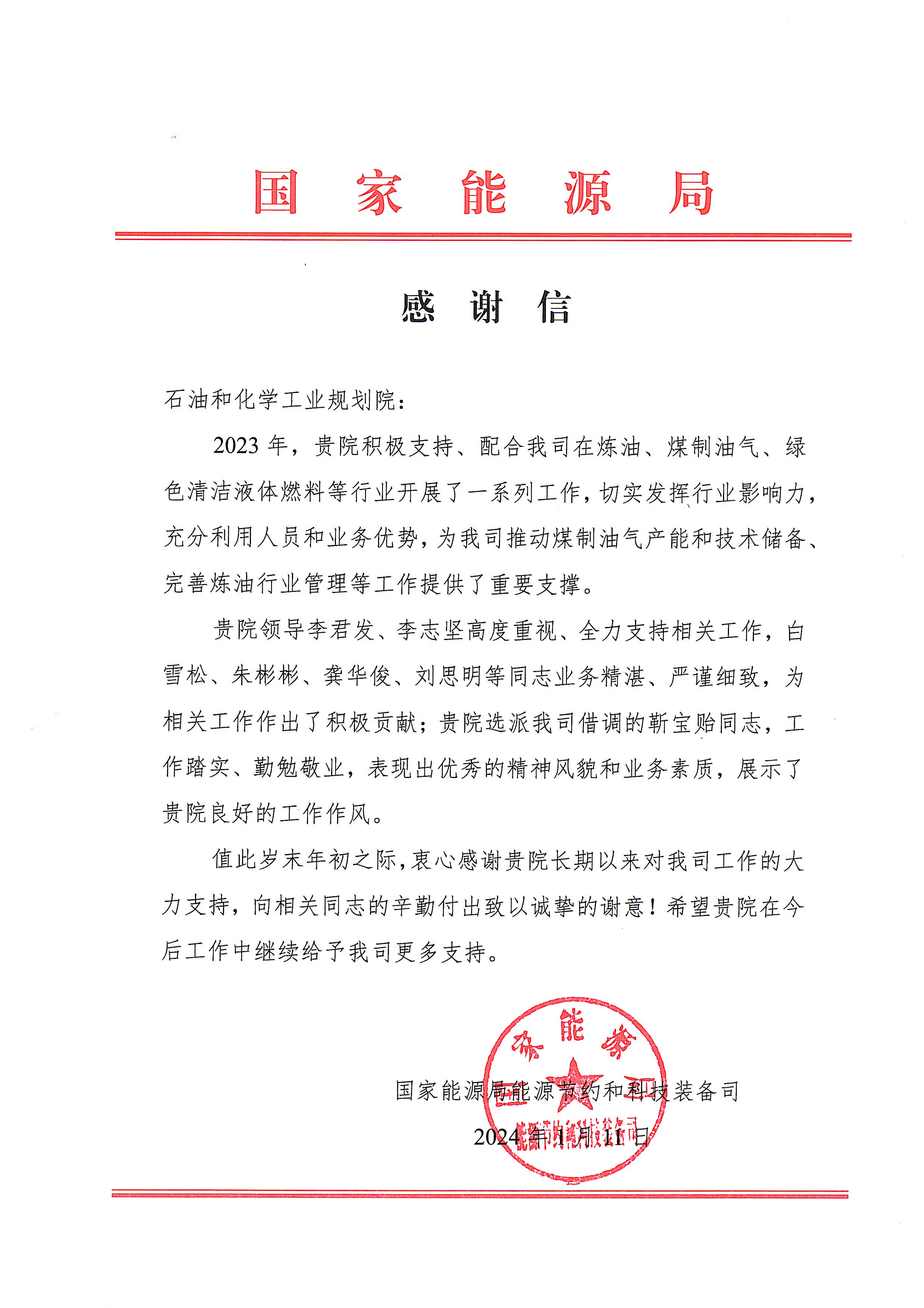 2023年,在李君發院長、李志堅副院長的帶領下,我院充分發揮自身人才和技術優勢,圍繞煉油、煤制油氣、綠色清潔液體燃料等行業發展的重要問題,積極配合國家能源局開展了一系列技術支撐工作,獲得國家能源局高度認可。